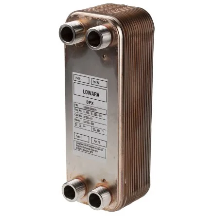 Brazed Plate Heat Exchangers. Lowara brazed heat exchangers are ideal for residential and light commercial hydronic systems as they provide maximum heat dissipation from a compact, lightweight heat exchanger. They offer a high level of thermal efficiency and durability with a corrugated, compact plate design. Features and Benefits. Approved according to pressure equipment PED 97-23-EC. Stainless steel 316L plates, copper brazed material. Up to 50.40 l/sec and 32.52 m² of surface area. Pressures up to 30 bar. Connections from inch to 4 inches. Product Application Information. Radiant floors. Domestic hot water. Pool heating. HVAC. Solar heating. District heating. Domestic/commercial boilers