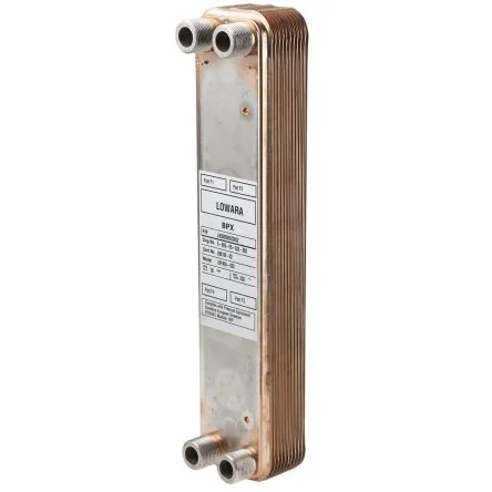 Brazed Plate Heat Exchangers. Lowara brazed heat exchangers are ideal for residential and light commercial hydronic systems as they provide maximum heat dissipation from a compact, lightweight heat exchanger. They offer a high level of thermal efficiency and durability with a corrugated, compact plate design. Features and Benefits. Approved according to pressure equipment PED 97-23-EC. Stainless steel 316L plates, copper brazed material. Up to 50.40 l/sec and 32.52 m² of surface area. Pressures up to 30 bar. Connections from inch to 4 inches. Product Application Information. Radiant floors. Domestic hot water. Pool heating. HVAC. Solar heating. District heating. Domestic/commercial boilers