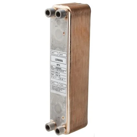 Brazed Plate Heat Exchangers. Lowara brazed heat exchangers are ideal for residential and light commercial hydronic systems as they provide maximum heat dissipation from a compact, lightweight heat exchanger. They offer a high level of thermal efficiency and durability with a corrugated, compact plate design. Features and Benefits. Approved according to pressure equipment PED 97-23-EC. Stainless steel 316L plates, copper brazed material. Up to 50.40 l/sec and 32.52 m² of surface area. Pressures up to 30 bar. Connections from inch to 4 inches. Product Application Information. Radiant floors. Domestic hot water. Pool heating. HVAC. Solar heating. District heating. Domestic/commercial boilers