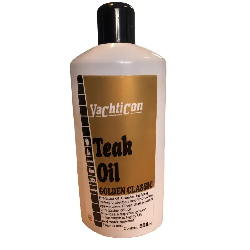 Yachticon Golden Classic teak oil 500 ml offers high-quality treatment for teak and fine woods, ideal for decks, nautical furniture, or walkways exposed to sun and salt.
