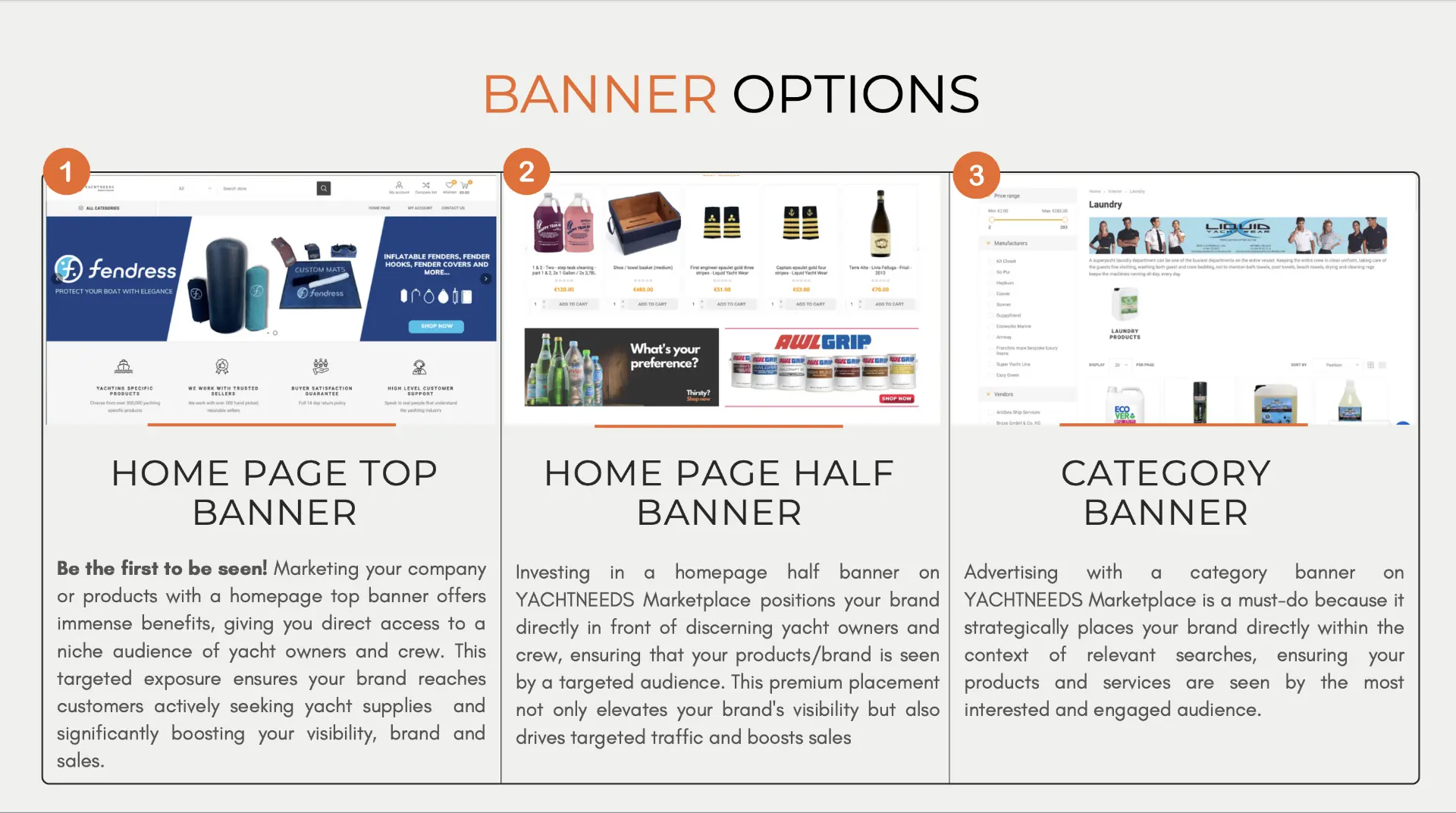Capture the attention of yacht professionals and decision-makers right where they're searching. With a Category Banner, your brand is placed front and center in the exact category your ideal customers are browsing.