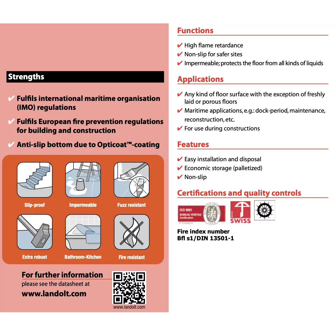 - Impermeable; protects the floor from all kinds of liquids (paint, solvents, …)