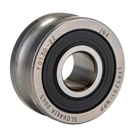 Single and Double Row Yoke Type Track Rollers. INA from Schaeffler ball bearing track rollers are self-retaining, single or double row ball bearings with particularly thick-walled outer rings. In addition to high radial forces, these bearings can also support axial forces in both directions. The outer rings have a crowned or cylindrical outside surface. Designs with a crowned outside surface are used where they are inclined in relation to the mating track and edge stresses must be avoided. Yoke type track rollers have outer rings with a crowned or cylindrical outside surface, inner rings and ball and cage assemblies with plastic cages. They are similar in construction to deep groove or angular contact ball bearings and are mounted on shafts or studs. Features and Benefits. Sealed on both sides. LR6, LR60 and LR2 series are single row units. LR50, LR52 and LR53 series are double row units. LFR5, outer ring has a gothic arch profile. Greased using a lithium soap grease to GA13. Product Application Information. Yoke type track rollers are suitable for applications such as cam gears, bed ways and conveying equipment. Suffixes. 2RSR - Lip seals on both sides, giving radial sealing action. 2Z - Sealing shields on both sides. X - Cylindrical outside surface. 2RS - Lip seals on both sides, giving axial sealing action