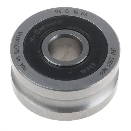 Single and Double Row Yoke Type Track Rollers. INA from Schaeffler ball bearing track rollers are self-retaining, single or double row ball bearings with particularly thick-walled outer rings. In addition to high radial forces, these bearings can also support axial forces in both directions. The outer rings have a crowned or cylindrical outside surface. Designs with a crowned outside surface are used where they are inclined in relation to the mating track and edge stresses must be avoided. Yoke type track rollers have outer rings with a crowned or cylindrical outside surface, inner rings and ball and cage assemblies with plastic cages. They are similar in construction to deep groove or angular contact ball bearings and are mounted on shafts or studs. Features and Benefits. Sealed on both sides. LR6, LR60 and LR2 series are single row units. LR50, LR52 and LR53 series are double row units. LFR5, outer ring has a gothic arch profile. Greased using a lithium soap grease to GA13. Product Application Information. Yoke type track rollers are suitable for applications such as cam gears, bed ways and conveying equipment. Suffixes. 2RSR - Lip seals on both sides, giving radial sealing action. 2Z - Sealing shields on both sides. X - Cylindrical outside surface. 2RS - Lip seals on both sides, giving axial sealing action