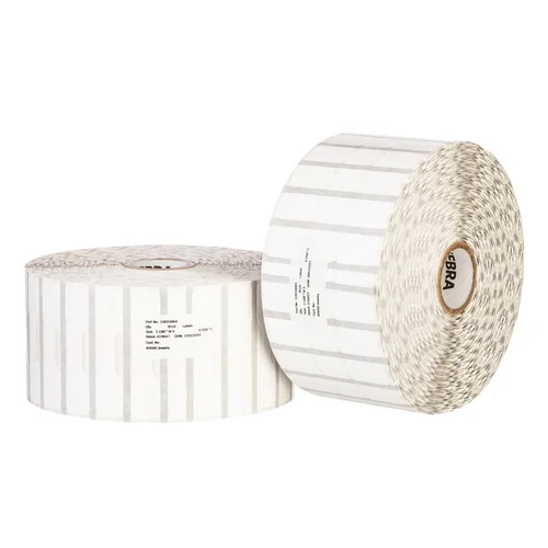 High-contrast white polypropylene labels for jewelry tags and ring labels, compatible with Zebra thermal printers.