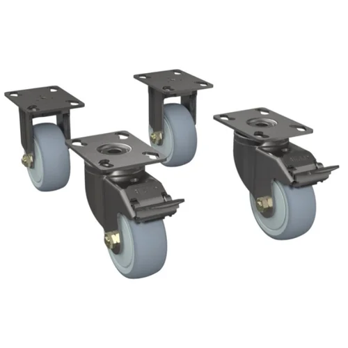 Easily move your rack mounts with Zebra's castor wheels featuring swivel front wheels and non-swivel rear wheels.