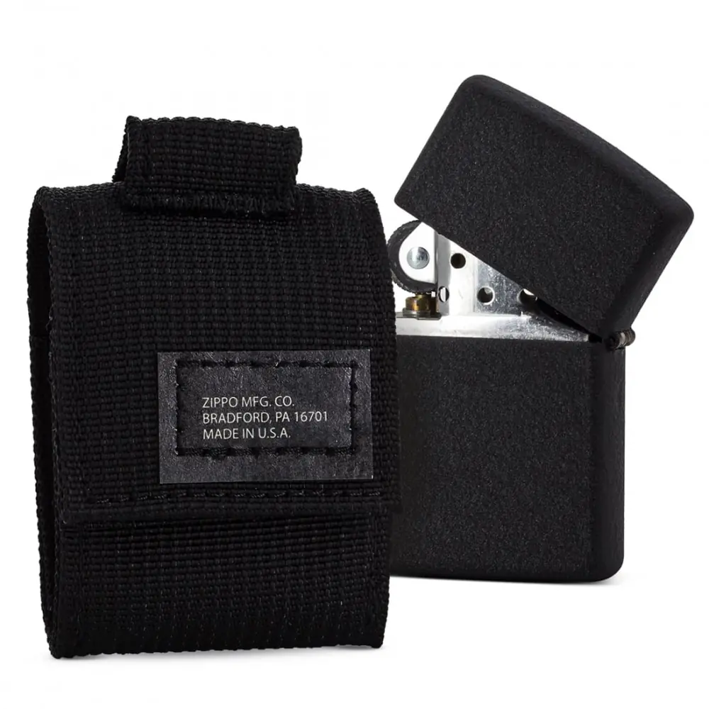 Box containing a zippo case and a zippo lighter both made in the united states. These two objects were previously intended for the american military so that they protect their lighter and always keep their zippo safe and close at hand.