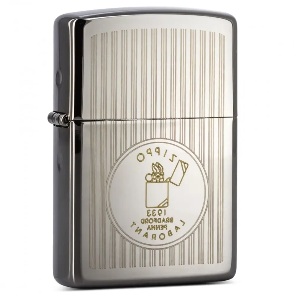 zippo lighter celebrating brand founder george g. blaisdell. very beautiful silver lighter with golden decoration and vertical lines reminiscent of the very first zippo.. . mark. zippo.