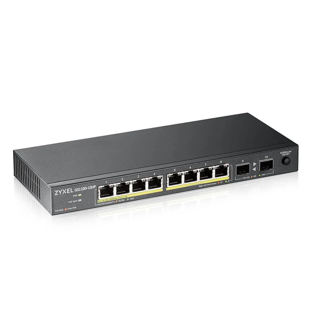 The Zyxel GS1100-10HP provides silent, energy-efficient Gigabit connectivity with PoE support for easy installation.