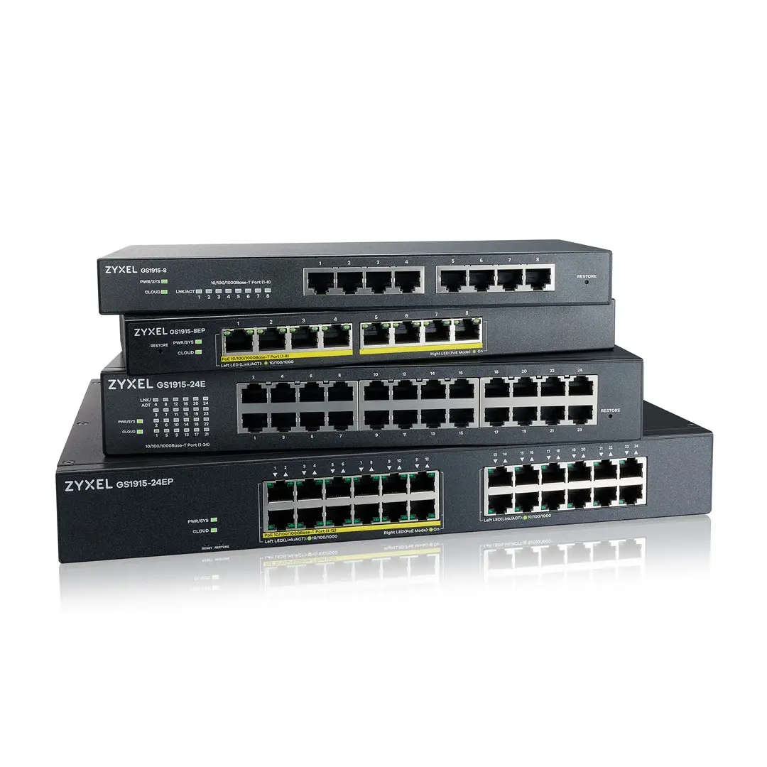 The Zyxel GS1915 Series offers 8/24-port GbE Smart Managed Switches with and without PoE connectivity to small business network. The GS1915 Series supports NebulaFlex that comes with handy features and superior performance. This series is the most affordable hybrid switch solution for SB/ SMB market. It can be easily setup through Nebula Control Center for cloud based unified management, or with its friendly Web GUI if you still prefer local setting. Simple, affordable way to go cloud Nebula provides both intuitive web interface and mobile APP to deliver a streamlined experience for installation and management of the network, without the additional cost for a software or hardware controller. Pro-users, small businesses, and chain stores can take advantage of Nebula to access real-time network information and enjoy centrally managed control over the GS1915 Smart Managed switches along with access points and security gateways. GS1915 series switch can satisfy requirements for a wide range of users; for Prosumers, it is able to ensure the quality connectivity for growing home IOT devices, for small business users, it can provide a sturdy network performance for daily operation, for chain store adoptions, it can manage and maintain multiple stores, all while carrying the flexibility to expand networking solution for new store locations instantly.NebulaFlex – simply manage it your way! The GS1915 Series supports NebulaFlex technology which provides extended flexibility for users to easily switch network management modes between standalone and our license-free Nebula cloud management platform. Nebula control center provides single pane of glass for Zyxel products; the local web GUI accesses the full feature set and all configuration options of your switch from the very first release.The Nebula ecosystem Nebula supports a comprehensive range of products from switches, access points, security firewalls, to 5G/LTE mobile routers, bringing you an easy and unified network experience. The Nebula APP allows to onboard devices and glance at real time network status easily. You also can reboot the abnormal AP/IP CAM by power cycle, or even block clients with unusual traffic remotely even when you are away.Compact size, silent operation The GS1915 Series comes with desktop dimensions, fanless design, and smart fan design (GS1915-24EP only). These slim and near-silent switches can perfectly blend into any working environment without intrusive fan noises.Intelligence to power more devices All PoE ports of GS1915-8EP and GS1915-24EP support IEEE 802.3at for maximum deployment of modern PoE devices. Each port provides up to 30 W with a total of 60 W and 130 W power budget, ideal for setups that just needs a few more APs and cameras for a small business. Both PoE models feature a default PoE consumption mode that delivers the actual power required by your networked devices, reserves the rest to optimize its power budget, allowing the switch to power more devices, and ensures a better ROI for your business.